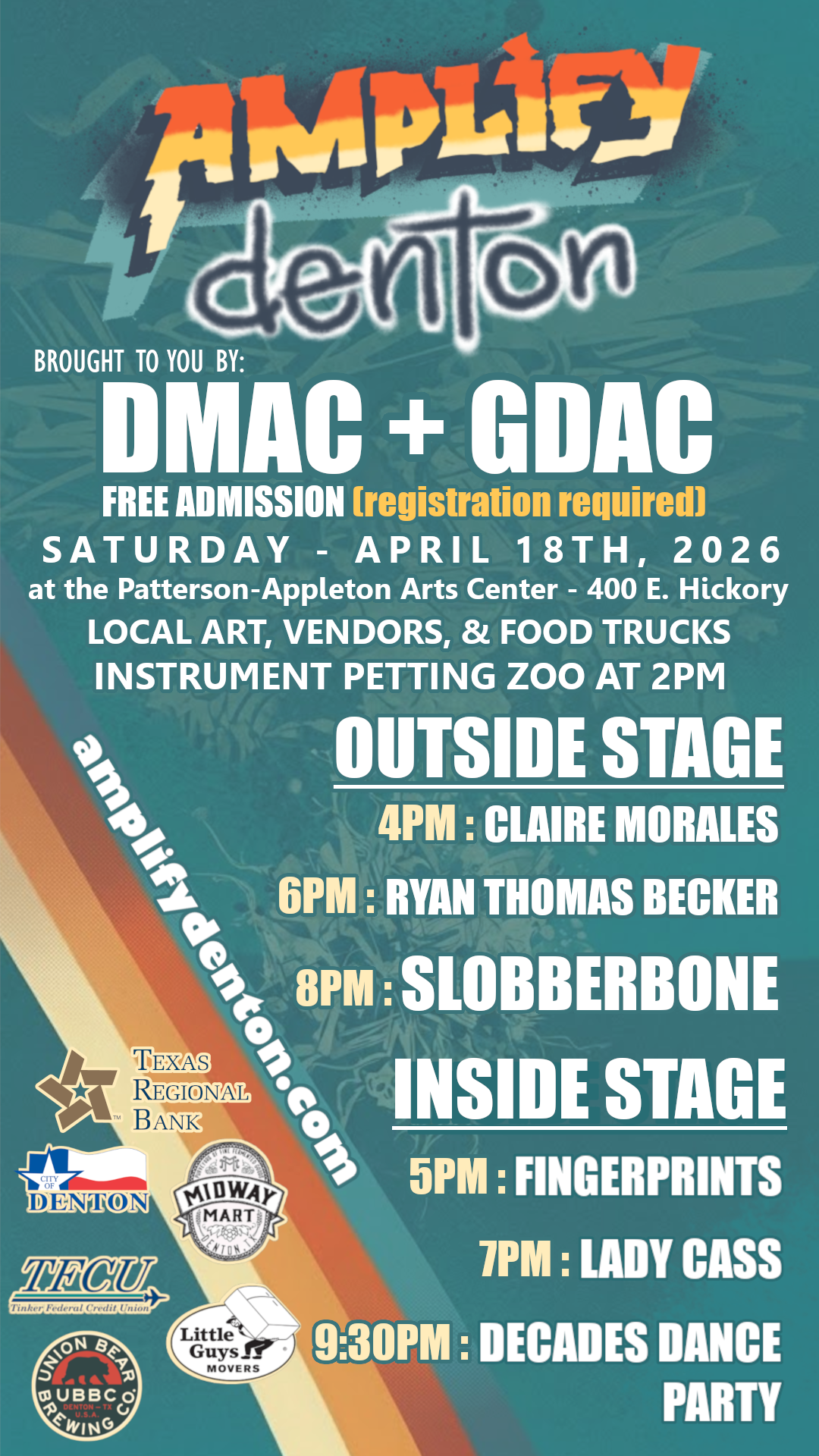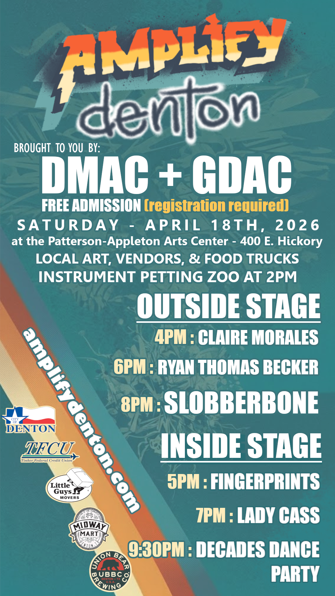 This year’s Amplify Denton Music and Arts Festival will take place at the Patterson-Appleton Arts Center (400 E Hickory St., Denton, TX, 76201) on Saturday April 18, 2026.